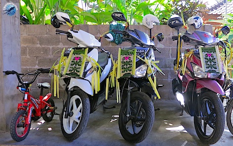 Les balinais aiment avoir des véhicules bien propres et l’on trouve facilement des échoppes de rue qui proposent ce service (“cuci motor”), mais ce matin-là, j’ai vu tous nos voisins récurer, eux-mêmes, leurs scooters, voitures, vélos….