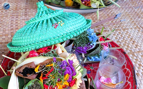 Elle prépare pour chaque objet un panier tressé en feuille de bananier avec 5 fleurs de couleur différentes,