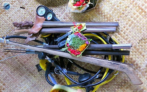 Puis, Tako dépose sur la grande natte les kriss traditionnels dont il a hérité de ses ancêtres et y ajoute ses harpons de pêche, quelques couteaux de cuisine.