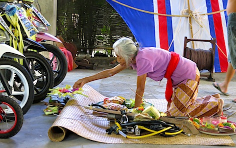 Puis, elle utilise une fleur de frangipanier qu’elle trempe dans de l’eau bénite (il s’agit en fait d’arrack, l’alcool local!) pour asperger les offrandes et tous ces objets.