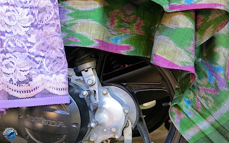 Elle n’oublie pas les rétroviseurs des scooters qui sont eux aussi décorés avec de petits fétiches mutins.