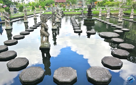 Un parc magique, surplombant des rizières en terrasse et avec l’île de Lombok en arrière-plan, où nous admirons les bassins poissonneux et les statues de la mythologie balinaise.