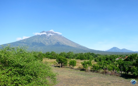 Arrivée à Tulamben : le sommet du Mont Agung est encore drappé d’un nuage douillet.